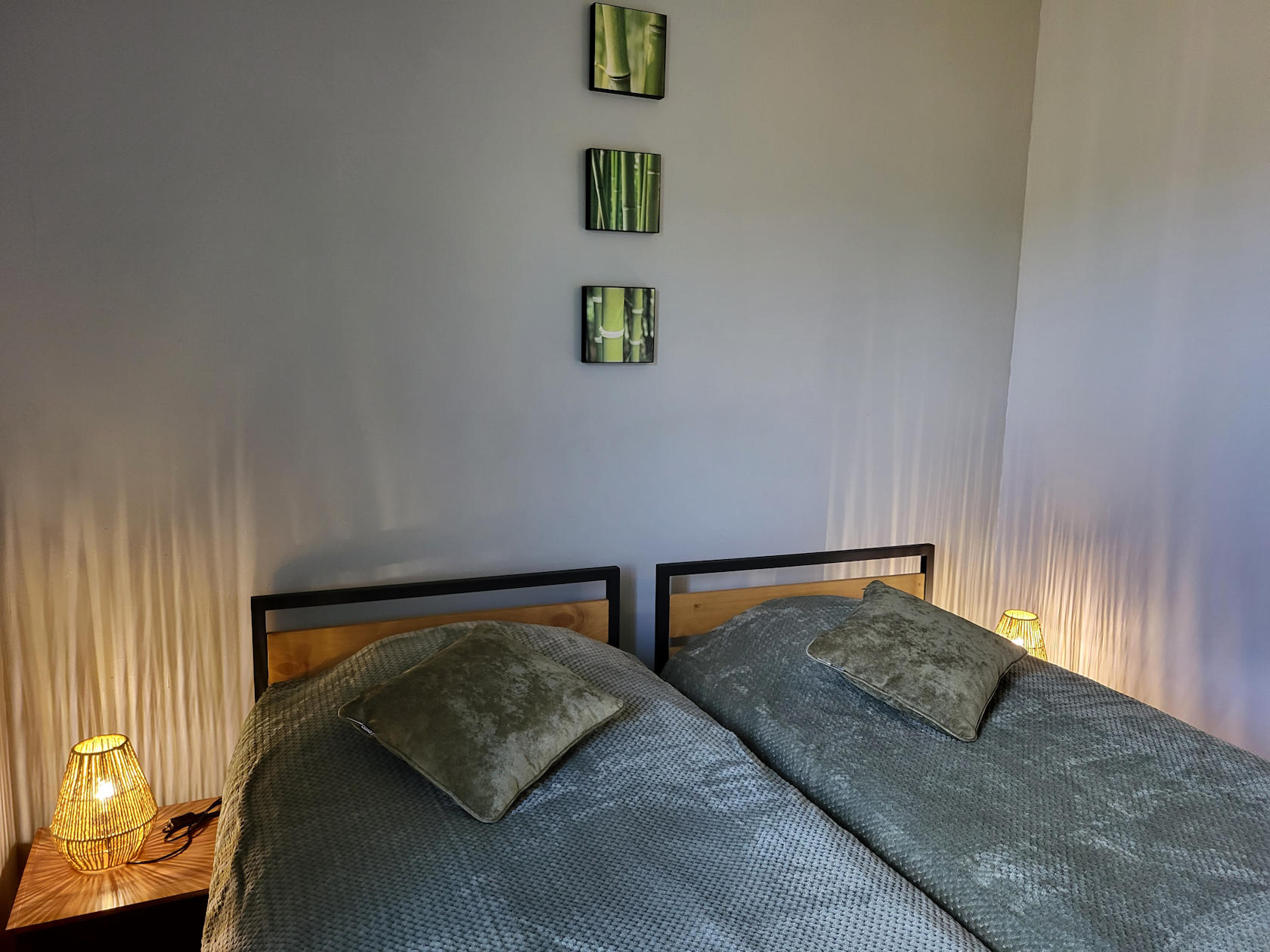 En haut de l'escalier,une mezzanine dessert les deux chambres(une avec un lit en 140, l'autre avec deux lits en 90), une salle de bains avec douche et des toilettes indépendantes.